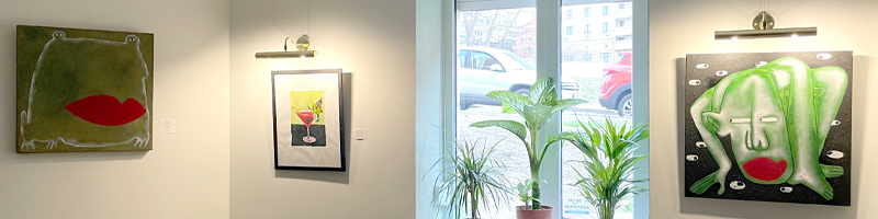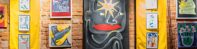 The display features a series of works created in the style of naïve art — filled with bright colors, playful shapes, emotional honesty, and a feeling of nostalgia for something that never actually happened, but feels like it could have.